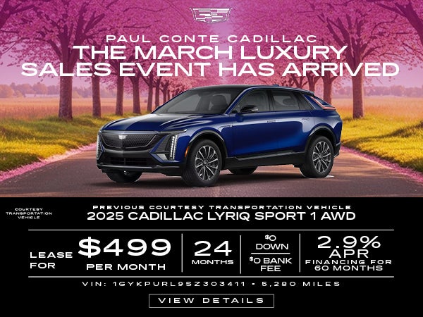 Stock: 25186C. VIN: 1GYKPURL9SZ303411. 5280 miles. Your payments may vary. For eligible new and unused models leased through GM Financial. Subject to tier 1 credit approval. No security deposit required. MSRP of $66,039. $0 Down, + 1st month pymt + Tax, title, license, and $0 Bank Fee due at signing. 24 monthly payments total $11,976. Option to purchase at lease end for an amount to be determined at lease signing. Mileage charge of $.25/mile over 14,720 miles. *Includes Costco Executive Private Offer, GM Rewards Card Sign Up & Spend, Cadillac EV Conquest Offer. Lessee pays for maintenance, repair, excess wear, and disposition fee of $0 or less at end of lease. See dealer for complete details. Offer expires 3.31.2026.